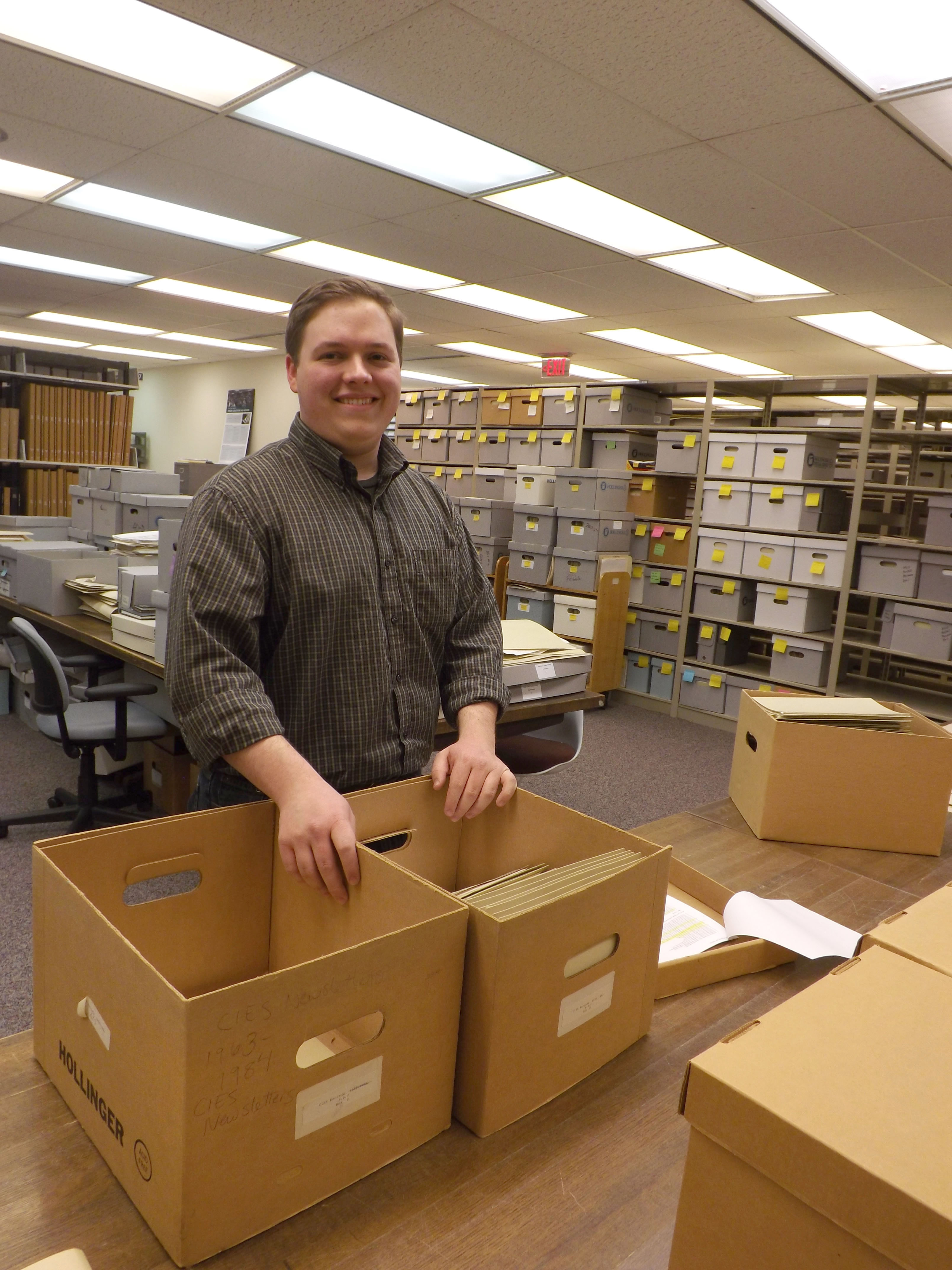 One of its co-founders was the late Dr. Gerald Read, KSU professor of education. The collection had grown to a large size since its establishment here in 1981, and processing this complex archive had become a challenge. Cara Gilgenbach, Head of Special Collections and Archives, submitted a proposal for funding to the organization, and CIES decided last year to kick-start a major processing update by providing funding ($3,000) for a student employee to work on the project. Special Collections hired KSU undergraduate history major Philip Shackelford to work on Phase I processing, which took place throughout the 2012/13 academic year. The department has also made a proposal to have the funding renewed at the same level for Phase II processing. This will enable the department to bring