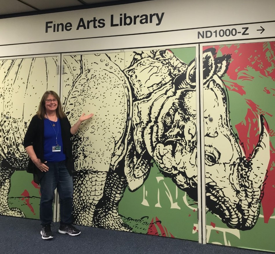 My role is to provide a welcoming face and safe space for our campus community to ask “the dumb question” or even the hard question so we can work to figure it out together. I have served in four different departments here at Alden Library—overnight supervisor at the reference desk; support staff in the Center for International Collections; support staff for the Fine Arts Library and support staff for our current two service points in the building. My current position is a mix of public service and finding creative ways to provide collection maintenance and promote our materials in the Fine Arts Library.