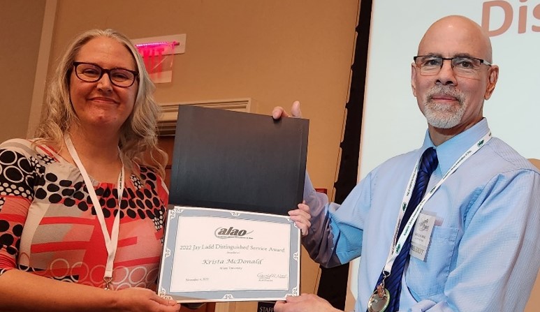 Another award that spotlights praiseworthy achievement at the conference is The Jay Ladd Distinguished Service Award, named in honor of a former Ohio State University librarian who played a large part in the formation of ALAO. Recipients of this award must have broadly promoted academic libraries and librarianship and have a strong record of leadership. This year the award was presented to Krista McDonald, Director of the Rentschler Library at Miami University–Hamilton. Krista has a sustained record of service and was described as an “active and vocal member” of ALAO’s Diversity Committee, including her work on ALAO’s Diversity toolkit and Diversity Action Task Force. She is a former ALAO President and Board member and is active in OhioLINK. Krista’s nominator notes that while her work merits recognition, Krista is known for her “passion, creativity, good humor, and commitment to justice.” [I was urged to make mention of Krista’s passion for camels (the animal), an in-joke among her colleagues.] As a further distinction, Krista is only the second person besides Kathryn Venditti to receive both the mentoring award and the distinguished service award.